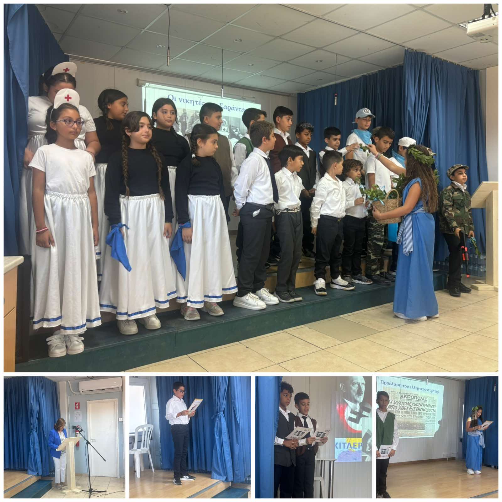 Τη Δευτέρα 27/10/25 τιμήσαμε στο Σχολείο μας το ηρωικό έπος του 1940 με μια όμορφη εκδήλωση - χρονικό, που ετοιμάστηκε από τις δασκάλες του Σχολείου. Στην εκδήλωση συμμετείχαν όλα τα παιδιά του Σχολείου!